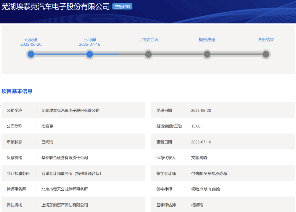 提交IPO申請近一個月后,蕪湖埃泰克汽車電子股份有限公司(以下簡稱“埃泰克”)的IPO審核狀態(tài)近日變更為“已問詢”。按照計劃,埃泰克此次擬募集15億元投向“埃泰克年產(chǎn)500萬件汽車電子項目”等四個建設(shè)項目以及補(bǔ)充流動資金。