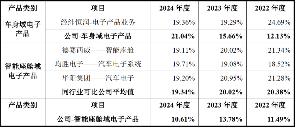 與此同時,埃泰克的毛利率卻低于同行。2022-2024年,與同行經(jīng)緯恒潤電子產(chǎn)品業(yè)務(wù)相比,埃泰克車身域電子產(chǎn)品毛利率差值分別在-12.56%、-3.63%、1.68%(如下圖所示);與同行可比平均值相比,埃泰克智能座艙域電子產(chǎn)品毛利率的差值分別在-8.89%、-6.24%、-8.73%。