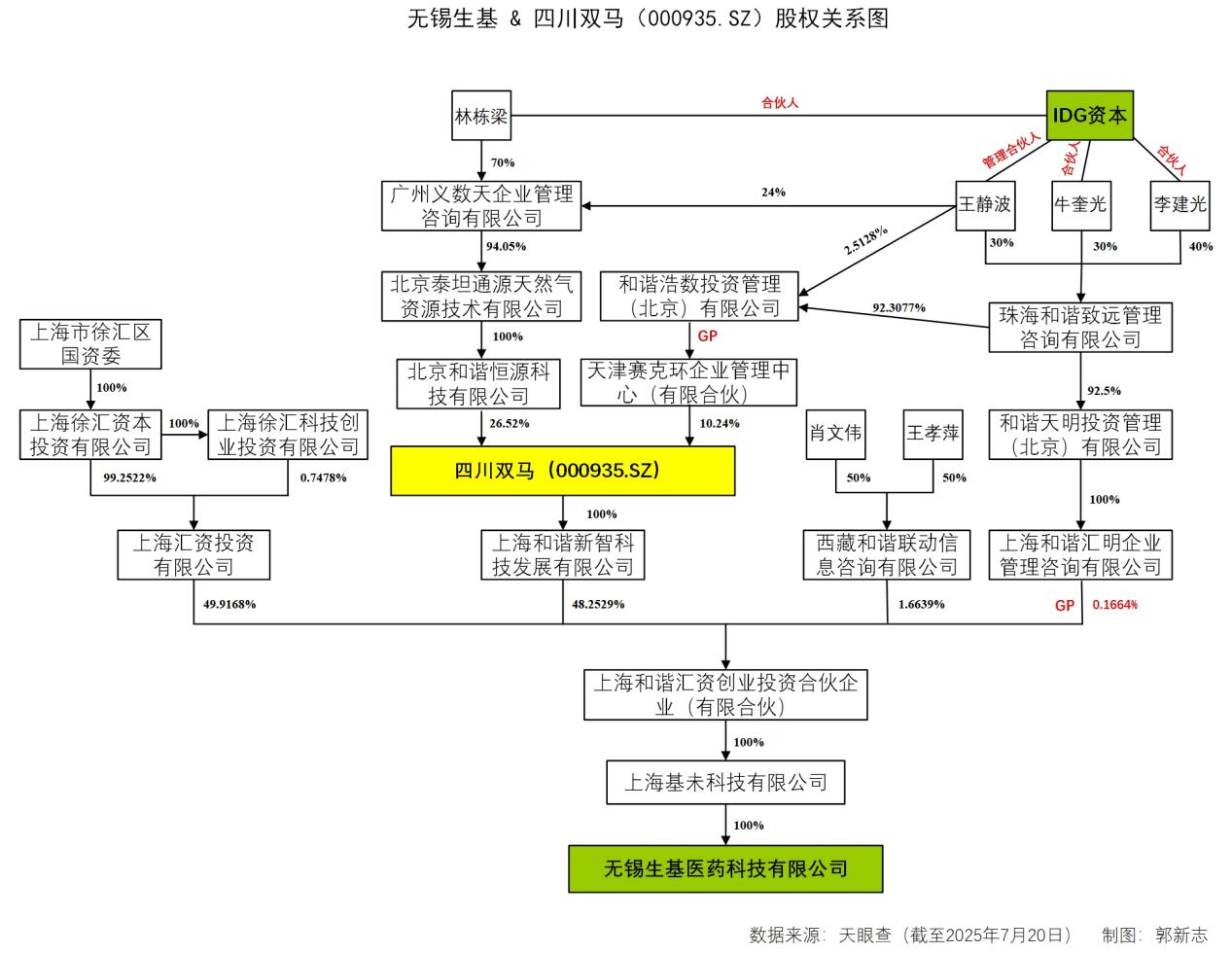 2025年7月8日,藥明生基股東變更為“上?;纯萍加邢薰尽保ê喎Q“上?;础保?,股權(quán)層層穿透后,無錫生基實(shí)際控制人指向IDG資本合伙人李建光,四川雙馬(000935.SZ)則以LP的身份間接成為無錫生基第二大股東。
