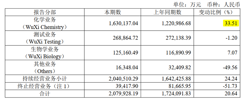 今年上半年,藥明康德各業(yè)務(wù)分部表現(xiàn)不一,化學(xué)業(yè)務(wù)依然是公司的業(yè)績支柱?!盎瘜W(xué)業(yè)務(wù)”是提供從化學(xué)藥物的發(fā)現(xiàn)研究,到臨床前和臨床階段開發(fā),到商業(yè)化生產(chǎn)的一體化、端到端的服務(wù),滿足各個(gè)階段、不同規(guī)模業(yè)務(wù)需求,涵蓋所有化學(xué)藥物的分子形式及所有類別,包括小分子、寡核苷酸、多肽及相關(guān)化學(xué)偶聯(lián)物,以及支持各類化學(xué)藥物的制劑業(yè)務(wù)。