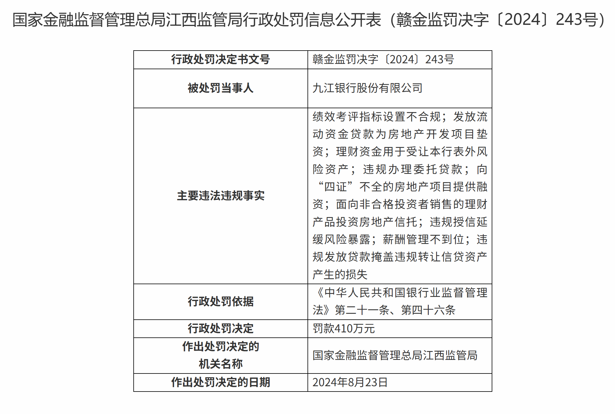 值得注意的是,信貸風(fēng)險管理不足已引發(fā)監(jiān)管高壓。其中,2024年10月25日,國家金融監(jiān)督管理總局江西監(jiān)管局向九江銀行開出一筆410萬元罰單,涉及多項嚴重違法違規(guī)行為,包括發(fā)放流動資金貸款為房地產(chǎn)開發(fā)項目墊資、理財資金用于受讓本行表外風(fēng)險資產(chǎn)、違規(guī)發(fā)放貸款掩蓋違規(guī)轉(zhuǎn)讓信貸資產(chǎn)產(chǎn)生的損失、違規(guī)授信延緩風(fēng)險暴露,多名責(zé)任人被警告罰款。