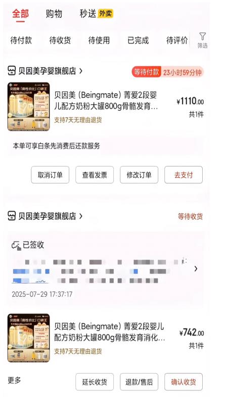 但記者發(fā)現(xiàn),一位在京東平臺購買過貝因美產(chǎn)品的消費者在社交媒體發(fā)布訂單截圖。圖片顯示,上述消費者于2025年7月底在貝因美孕嬰旗艦店購買了6罐貝因美菁愛2段嬰兒配方奶粉(800克),購買價格為742元。然而在8月初價格卻變?yōu)榱?110元。