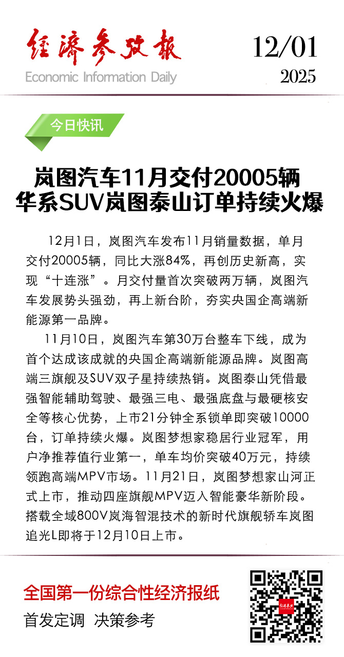 嵐圖高端三旗艦及SUV雙子星持續(xù)熱銷(xiāo)。嵐圖泰山憑借最強(qiáng)智能輔助駕駛、最強(qiáng)三電、最強(qiáng)底盤(pán)與最硬核安全等核心優(yōu)勢(shì),上市21分鐘全系鎖單即突破10000臺(tái),訂單持續(xù)火爆。嵐圖夢(mèng)想家穩(wěn)居行業(yè)冠軍,用戶凈推薦值行業(yè)第一,單車(chē)均價(jià)突破40萬(wàn)元,持續(xù)領(lǐng)跑高端MPV市場(chǎng)。11月21日,嵐圖夢(mèng)想家山河正式上市,推動(dòng)四座旗艦MPV邁入智能豪華新階段。搭載全域800V嵐海智混技術(shù)的新時(shí)代旗艦轎車(chē)嵐圖追光L即將于12月10日上市。(鐘新)
