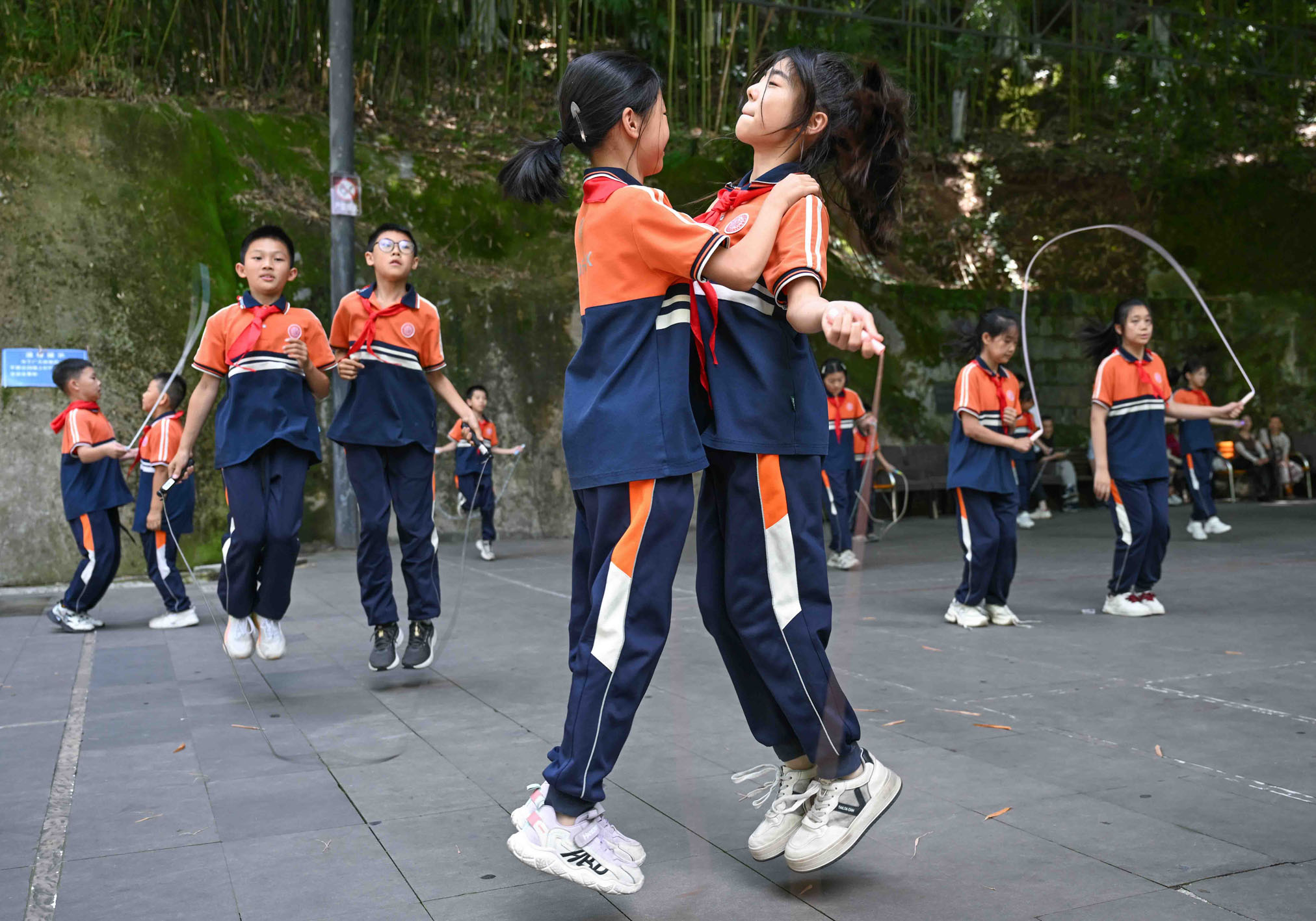 圖為今年5月重慶市墊江縣鳳山小學學生在鳳山公園練習花式跳繩。新華社記者 陳誠 攝
