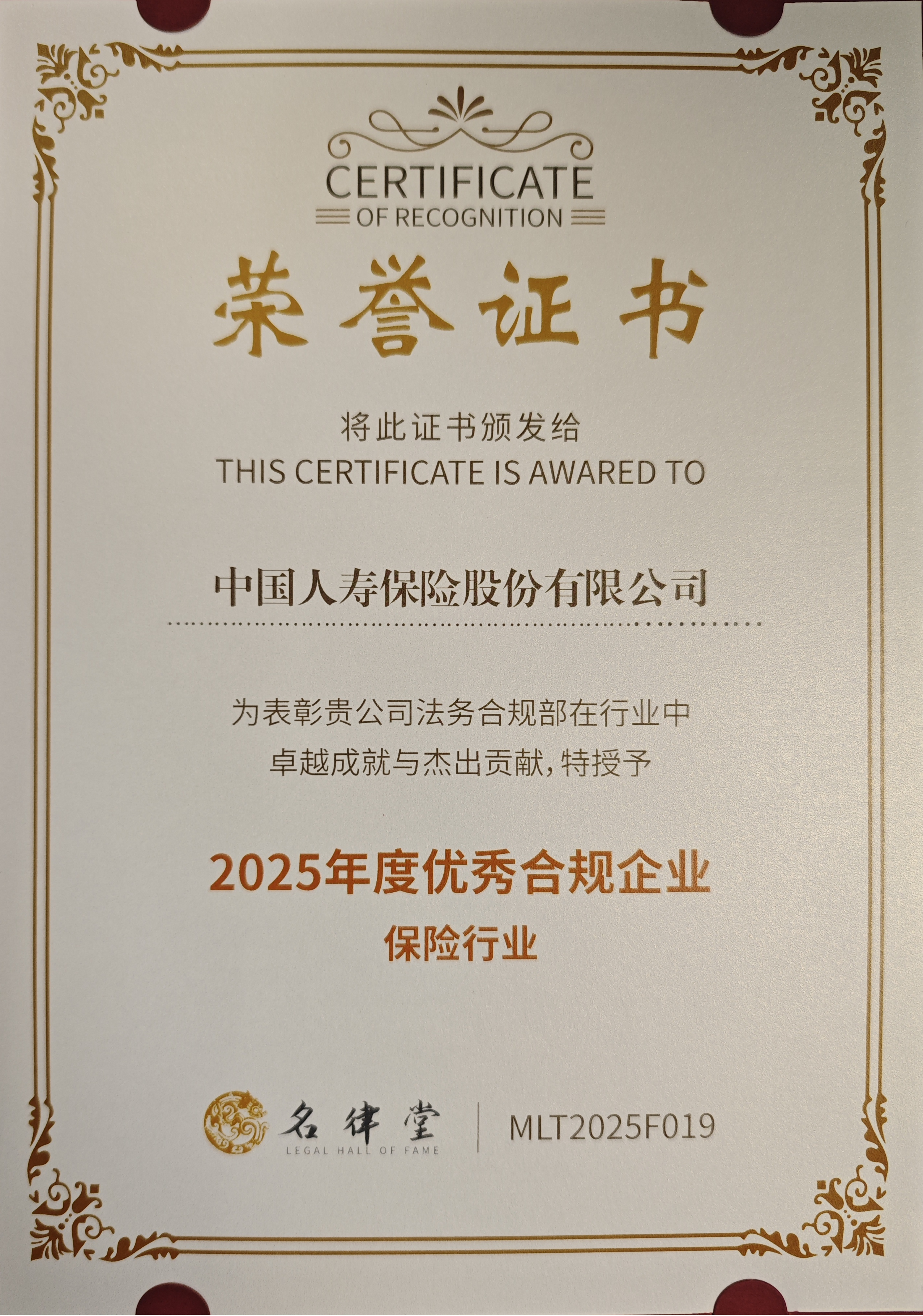 近日,在國內(nèi)法律行業(yè)交流平臺名律堂組織的“2025年企業(yè)合規(guī)先鋒榜”評選項目中,中國人壽保險股份有限公司(簡稱“中國人壽”,601628.SH,2628.HK)榮獲保險行業(yè)“2025年度優(yōu)秀合規(guī)企業(yè)”。