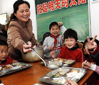 合肥市下崗工人羅莉莉(左二)在給孩子們盛菜。羅莉莉在當?shù)亟值赖膸椭麻_辦了一家餐館。新華社發(fā) |