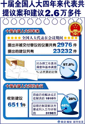 十屆全國(guó)人大四年來代表共提議案和建議2.6萬(wàn)多件
