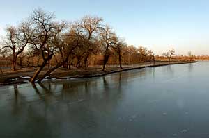 大片的胡楊林得到了黑河水的滋養(yǎng)(攝于3月13日)。近年來(lái),內(nèi)蒙古額濟(jì)納綠洲生態(tài)環(huán)境明顯好轉(zhuǎn)。黑河水的抵達(dá)使沿河30多萬(wàn)畝瀕臨死亡的胡楊、檉柳得到了灌溉,這對(duì)阻擋沙漠推移,減少沙塵暴發(fā)生頻率和強(qiáng)度起到了積極作用。新華社記者