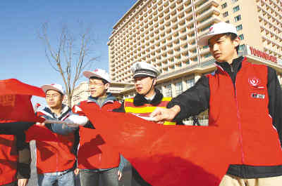 兩會期間,首都百萬奧運社會志愿者將廣泛開展城市交通秩序維護、社區(qū)治安巡邏等服務(wù)。圖為3月3日,在王府井路口,志愿者在交警的輔導(dǎo)下進行上崗前培訓(xùn)。
