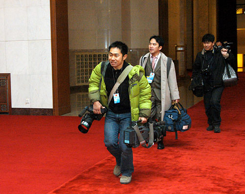 3月5日上午9時,第十一屆全國人民代表大會第一次會議在人民大會堂開幕,聽取國務(wù)院總理溫家寶作政府工作報告,審查年度計劃報告和預(yù)算報告。圖為外國記者在報到。新華網(wǎng) 陳競超 攝