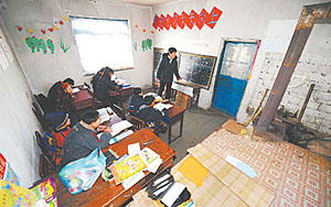 一間不足20平米的瓦房里,大通鋪上,沒有棉被,只有羊皮和狗皮做的“褥子”,這就是24個(gè)小學(xué)生的“床”;桌子上擺放著幾個(gè)鐵皮罐頭空盒,這就是學(xué)生們的“水杯”;教室里,3個(gè)年級的孩子們在一位老師的帶領(lǐng)下寫著作業(yè),窗外堆滿了課余時(shí)間老師帶著學(xué)生們撿回來的牛糞,那是過冬用的取暖原料……這是青海省高原地區(qū)寄宿學(xué)校的典型寫照。
