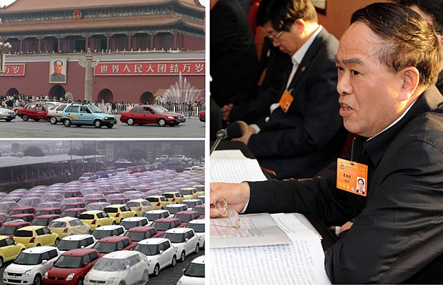 小排量轎車行駛在北京長(zhǎng)安街上(左上圖)。整裝待發(fā)的長(zhǎng)安汽車集團(tuán)小排量汽車(右下圖)。新華社發(fā)