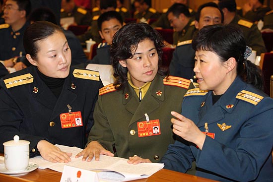 在十一屆全國(guó)人大解放軍代表團(tuán)的代表中,有22名女代表,分別來(lái)自戰(zhàn)備訓(xùn)練、國(guó)防科研、醫(yī)療衛(wèi)生、文藝體育等多個(gè)戰(zhàn)線。她們?cè)趪?guó)防和軍隊(duì)建設(shè)中發(fā)揮了重要作用,在人代會(huì)上忠實(shí)履行著自己的職責(zé)。