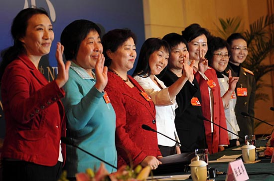 3月8日,在北京參加十一屆全國人大一次會(huì)議的8位女代表在北京兩會(huì)新聞中心接受記者集體采訪。