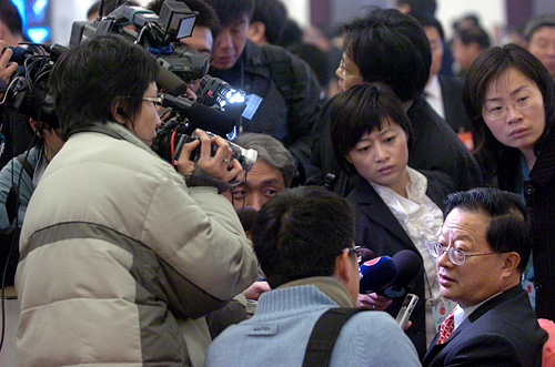2008年3月10日上午9時(shí),第十一屆全國(guó)人民代表大會(huì)第一次會(huì)議在人民大會(huì)堂舉行第三次全體會(huì)議,聽取最高人民法院院長(zhǎng)肖揚(yáng)作最高人民法院工作報(bào)告;聽取最高人民檢察院檢察長(zhǎng)賈春旺作最高人民檢察院工作報(bào)告。圖為大會(huì)開始前記者采訪人大代表。 |