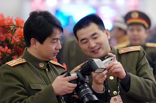 2008年3月10日上午9時(shí),第十一屆全國(guó)人民代表大會(huì)第一次會(huì)議在人民大會(huì)堂舉行第三次全體會(huì)議,聽取最高人民法院院長(zhǎng)肖揚(yáng)作最高人民法院工作報(bào)告;聽取最高人民檢察院檢察長(zhǎng)賈春旺作最高人民檢察院工作報(bào)告。圖為兩位解放軍代表團(tuán)工作人員在查看照片。 |