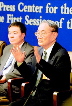 | 圖為昨天(3月10日),全國政協(xié)委員厲以寧就“民主黨派幫助畢節(jié)地區(qū)脫貧致富”主題接受記者集體采訪。吳鏑/攝 | “后奧運(yùn)”中國經(jīng)濟(jì)不會滑坡