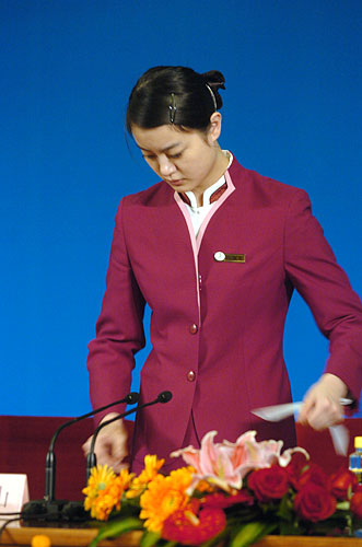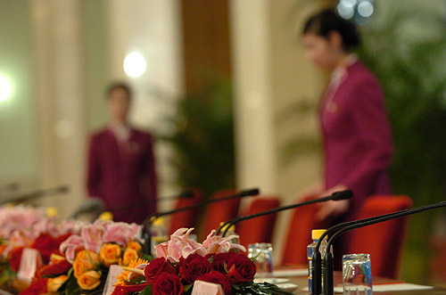 3月18日上午十一屆全國人大一次會(huì)議閉幕后,國務(wù)院總理溫家寶在人民大會(huì)堂三樓中央大廳與采訪十一屆全國人大一次會(huì)議的中外記者見面并回答記者提出的問題。圖為工作人員在作準(zhǔn)備。