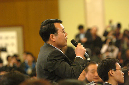 3月18日,國務院總理溫家寶和副總理李克強、回良玉、張德江、王岐山在北京人民大會堂與中外記者見面,并回答記者提問。圖為新華社記者在提問。