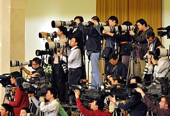 3月18日,國務(wù)院總理溫家寶和副總理李克強(qiáng)、回良玉、張德江、王岐山在北京人民大會堂與中外記者見面,并回答記者提問。這是攝影、攝像記者在現(xiàn)場采訪拍攝。新華社記者 樊如鈞 攝