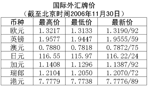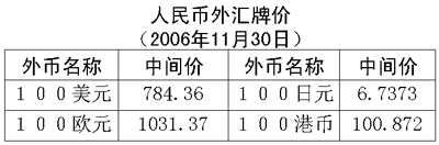 根據(jù)中國人民銀行授權(quán)中國外匯交易中心發(fā)布的公告,2006年11月30日銀行間外匯市場美元等交易貨幣對人民幣匯率的中間價(jià)為:1美元兌人民幣7.8436元,1歐元兌人民幣10.3137元,100日元兌人民幣6.7373元,1港幣兌人民幣1.00872元,1英鎊兌人民幣15.2629元。