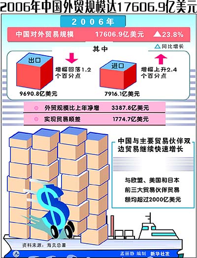 海關(guān)總署10日公布,2006年我國(guó)對(duì)外貿(mào)易規(guī)模高達(dá)17606.9億美元,比2005年增長(zhǎng)23.8%,我國(guó)對(duì)外貿(mào)易發(fā)展增速已經(jīng)連續(xù)5年保持在20%以上。2006年我國(guó)外貿(mào)比2005年凈增加3387.8億美元,超過(guò)1998年全年的進(jìn)出口規(guī)模。2006年我外貿(mào)出口9690.8億美元,增長(zhǎng)27.2%,同比回落1.2個(gè)百分點(diǎn);進(jìn)口7916.1億美元,增長(zhǎng)20%,同比上升2.4個(gè)百分點(diǎn)。