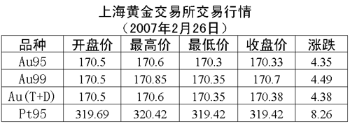 26日,上海黃金交易所黃金Au99.95收盤于170.33元/克,上漲4.35元/克,共成交5582公斤;黃金Au99.99收盤于170.70元/克,上漲4.49元/克,共成交964.80公斤;鉑金Pt99.95收盤于319.42元/克,上漲8.26元/克,共成交106公斤。黃金Au(T+D)延期交易品種收盤于170.38元/克,上漲4.38元/克,共成交2454公斤。