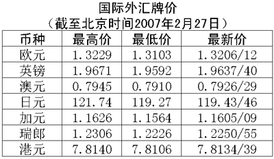 根據(jù)中國人民銀行授權中國外匯交易中心發(fā)布的公告,2007年2月27日銀行間外匯市場美元等交易貨幣對人民幣匯率的中間價為:1美元兌人民幣7.7471元,1歐元兌人民幣10.2110元,100日元兌人民幣6.4270元,1港幣兌人民幣0.99170元,1英鎊兌人民幣15.2053元。
