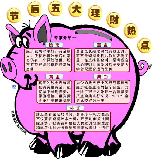 辭舊迎新的時(shí)節(jié),基金公司忙著分紅,保險(xiǎn)公司急著推出新產(chǎn)品,銀行的人民幣理財(cái)產(chǎn)品更是拉開陣勢(shì)搞促銷。剛剛享受過(guò)2006年紅紅火火的理財(cái)經(jīng)歷,使得人們?cè)谧哂H訪友、恭賀農(nóng)歷新年之余,也大都開始悄悄地為自己謀劃新年的“發(fā)財(cái)計(jì)劃”。