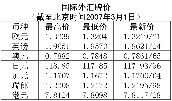 根據(jù)中國人民銀行授權(quán)中國外匯交易中心發(fā)布的公告,2007年3月1日銀行間外匯市場美元等交易貨幣對(duì)人民幣匯率的中間價(jià)為:1美元兌人民幣7.7472元,1歐元兌人民幣10.2544元,100日元兌人民幣6.5289元,1港幣兌人民幣0.99174元,1英鎊兌人民幣15.2174元。