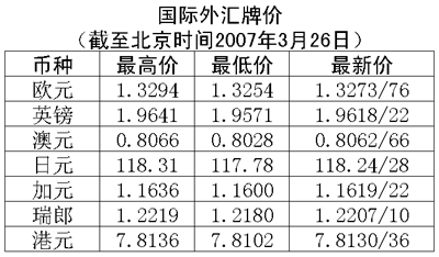 根據(jù)中國人民銀行授權(quán)中國外匯交易中心發(fā)布的公告,2007年3月26日銀行間外匯市場美元等交易貨幣對人民幣匯率的中間價(jià)為:1美元兌人民幣7.7393元,1歐元兌人民幣10.2711元,100日元兌人民幣6.5637元,1港幣兌人民幣0.99063元,1英鎊兌人民幣15.1691元。