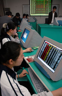 3月30日,杭州啟正中學(xué)的學(xué)生在上股市投資課。 從2007年新學(xué)期起,杭州啟正中學(xué)開設(shè)旨在培養(yǎng)青少年金融理財(cái)素質(zhì)的理財(cái)投資課,讓中學(xué)生們?cè)谑煜す善薄⒒、錢幣和字畫等理財(cái)投資方式的同時(shí),合理使用手頭的壓歲錢及零花錢,從小培養(yǎng)孩子們的金融理財(cái)意識(shí)。 |