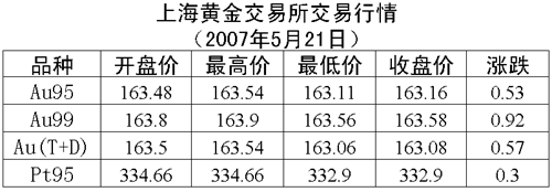21日,上海黃金交易所黃金Au100g收盤(pán)于165.16元/克,上漲0.16元/克,共成交0.60公斤;黃金Au50g收盤(pán)于165.00元/克,下跌6.50元/克,共成交0.20公斤;黃金Au99.95收盤(pán)于163.16元/克,上漲0.53元/克,共成交2216公斤;黃金Au99.99收盤(pán)于163.58元/克,上漲0.92元/克,共成交632.20公斤;鉑金Pt99.95收盤(pán)于332.90元/克,上漲0.30元/克,共成交64公斤;黃金Au(T+D)遞延交易品種收盤(pán)于163.08元/克,上漲0.57元/克,共成交1516公斤。