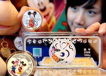 | 中國印鈔造幣總公司發(fā)行的“福鼠賀歲”鼠年生肖金銀條和“迪士尼2008米奇紀念章”。新華社發(fā) | 銀條類藏品頻繁亮相