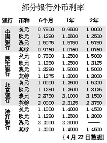 在所有的理財方式中,儲蓄存款被認為是最為安全、保守的一種。不少人誤以為各個銀行的外幣存款利率是一致的,其實不然,外幣存款利率在不同的銀行間是有差異的。 近期,由于國際金融市場利率持續(xù)下降,不少銀行下調了小額(300萬美元以下)外幣存款的利率。例如,4月11日,工商銀行調整境內美元、港幣、英鎊、加元小額存款利率;建設銀行4月10日起調整境內美元存款利率;此外,農行于3月26日下調了英鎊、澳元、加元、新加坡元、瑞士法郎5種外幣存款利率;中國銀行于3月25日下調英鎊、澳元的外幣存款利率。 記者了解到,利率下調后,在某些幣種上,各銀行間的存款利率差異仍然很大。以美元為例,有的銀行二年期的存款利率為1.00%,有的為1.50%,而北京銀行的二年期美元存款利率則為1.52%。澳元方面,差異就更為明顯,北京銀行一年期的澳元存款利率為3.10%,遠遠高于其他銀行的1.50%。英鎊方面,北京銀行和深圳發(fā)展銀行的一年期英鎊存款利率為2.3125%,也高于1.25%左右的平均利率水平。
