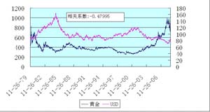 圖5是美元與黃金的相關(guān)性曲線,數(shù)據(jù)記錄了1979年11月到2008年12月間的關(guān)聯(lián)性,其中,它們的相關(guān)系數(shù)為-0.47995,是負的相關(guān)性。