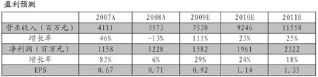 銀河證券預(yù)計(jì),招商地產(chǎn)2009年來自于房地產(chǎn)的銷售收入約60億元,物業(yè)租賃5.5億元。2009年主營收入約76億元,歸屬于母公司凈利潤16.65億元,每股收益0.97元。