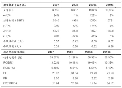 公司預(yù)計(jì)在2009年6月30日前完成目標(biāo)資產(chǎn)交割的前提下,2009年歸屬于母公司所有者凈利潤能達(dá)到63億左右,每股收益達(dá)到0.575元,相對2008年有較大幅度提升。
