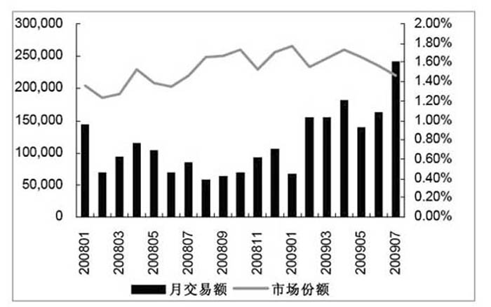 各月長江代理買賣證券總量和市場份額(包括股票、基金、權(quán)證和債券)