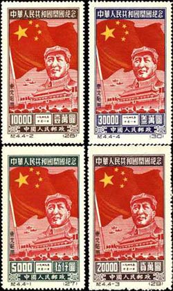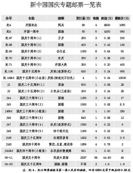 新中國(guó)的國(guó)慶紀(jì)念專題郵票始于1950年的紀(jì)4《開(kāi)國(guó)紀(jì)念》,以后在國(guó)慶的一、十、十五、二十五、三十、三十五、四十、五十以及五十五周年又分別發(fā)行紀(jì)念郵票,至今共約19套之多。