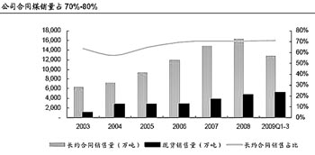 1、2009年產(chǎn)銷量將大幅超過計劃量,四季度增長值得期待。公司前三季度商品煤產(chǎn)銷量分別完成計劃的80.6%和85.4%,同比增長15.2%和10.4%。四季度是動力煤的傳統(tǒng)旺季,加上經(jīng)濟復(fù)蘇對煤炭的需求增長,預(yù)計四季度煤炭產(chǎn)銷量同比將繼續(xù)增長,超過全年計劃。 2、在建礦是未來三年內(nèi)生性增長的主要來源。公司的自產(chǎn)煤炭業(yè)務(wù)未來仍具很大的增長潛力。近3年內(nèi),公司建設(shè)的煤礦有較為明確的增產(chǎn)預(yù)期:布爾臺煤礦、哈爾烏素露天礦、勝利一號露天礦、黃玉川煤礦將在2009年-2011年陸續(xù)全部投產(chǎn),四個煤礦的設(shè)計年產(chǎn)量達到了6500萬噸。布爾臺礦和哈爾烏蘇礦錦界產(chǎn)能大量釋放。 3、五年內(nèi)增長確定,新街和榆神項目將增加2億產(chǎn)能。公司未來主要增長來源是兩個億噸級礦區(qū):新建內(nèi)蒙古新街和陜西榆神兩個億噸級礦區(qū)。目前,兩項在實施前期準(zhǔn)備工作,預(yù)計可新增儲量200多億噸。這兩個項目未來有望分別貢獻1億噸的產(chǎn)能,兩個礦將于2013年投產(chǎn),2015年達產(chǎn)。 |