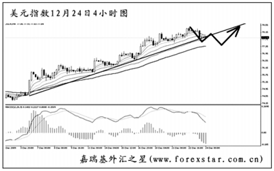 上周美元指數(shù)連續(xù)第三周攀升,近期延續(xù)強(qiáng)勁反彈步伐。美聯(lián)儲(chǔ)利率會(huì)議是上周外匯市場(chǎng)最重磅的事件,會(huì)后聲明中美聯(lián)儲(chǔ)對(duì)經(jīng)濟(jì)前景更加樂觀,且重申將在明年2月結(jié)束多數(shù)緊急貸款工具的計(jì)劃,該聲明對(duì)于美元上周大漲居功至偉。 美元指數(shù)上周大漲1.6%,上周五一度觸及三個(gè)月高點(diǎn)78.14。由于美國(guó)11月非農(nóng)就業(yè)數(shù)據(jù)以及最新的美聯(lián)儲(chǔ)會(huì)議推動(dòng)近期美元大幅上漲,目前有越來越多的市場(chǎng)人士對(duì)于2010年美元前景更加樂觀,甚至有專家認(rèn)為美元當(dāng)前走勢(shì)與2008年下半年上漲行情開始時(shí)有些相似,未來可能將迎來一段相當(dāng)長(zhǎng)時(shí)間的反彈。 越來越多的證據(jù)表明,鼓舞人心的經(jīng)濟(jì)消息正在對(duì)美元匯率產(chǎn)生積極影響,而圍繞希臘等歐元區(qū)國(guó)家債務(wù)負(fù)擔(dān)的憂慮令風(fēng)險(xiǎn)性資產(chǎn)承壓。此外,由于今年大幅增加的風(fēng)險(xiǎn)性資產(chǎn)投資主要是以低利率的美元作為融資貨幣,部分投資者選擇在年底前解除看空美元的頭寸。 除了上述因素之外,許多在年內(nèi)進(jìn)行美元融資套利交易的投資者在平倉(cāng),美元也因此受到提振。美元當(dāng)前的走勢(shì)與2008年下半年上漲行情開始時(shí)有些相似;美元在去年7月下旬和8月初迅速上漲5%,打破了連續(xù)數(shù)年的跌勢(shì),在之后的七個(gè)月內(nèi),美元累計(jì)漲幅高達(dá)25%。近期美元打破跌勢(shì)是否也會(huì)成為類似漲勢(shì)的開端,這將是市場(chǎng)人士關(guān)注的一個(gè)焦點(diǎn)。 從圖上看,美元指數(shù)沿著陡峭的斜率一路上沖,4小時(shí)圖均線系統(tǒng)呈多頭排列,圖中的上升趨勢(shì)線依托匯價(jià)。短線美元指數(shù)出現(xiàn)了一定程度的下挫,且隨時(shí)有可能發(fā)生一波大B浪回調(diào)。建議關(guān)注最近的兩個(gè)道氏理論顯著低點(diǎn)支撐77.55和77.35,不有效跌破此位是美元指數(shù)延續(xù)漲勢(shì)的關(guān)鍵。