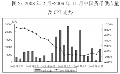 除了世界經(jīng)濟復蘇拉動大宗商品的需求、推動其價格上漲之外,另一個重要因素就是全球性流動性過剩導致商品價格上漲。 2008年底至2009年初,為了應對金融危機,各國紛紛出臺了救市措施,向市場中注入了大量的流動性。一般說來,從貨幣的發(fā)行到最后產(chǎn)生通貨膨脹需要一個傳導過程(基礎原材料→生產(chǎn)資料→下游消費品),而這一傳導過程一般需要一年左右的時間。10月初,澳大利亞率先提高本國利率,表明其已經(jīng)感覺到本國通貨膨脹的苗頭,而我國目前雖然沒有發(fā)生通貨膨脹,但11月份CPI同比增長已經(jīng)由負轉(zhuǎn)正(見圖2)。因此,我們認為,由于各國貨幣的過量發(fā)行,2010年世界性的通貨膨脹將會再次到來,而這無疑會推高大宗商品的價格。