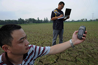 2009年7月15日,安徽六安市國元農(nóng)業(yè)保險公司的員工在舒城縣百神廟鎮(zhèn)開展查災(zāi)定損賠付工作,工作人員用GPS衛(wèi)星定位儀確定受災(zāi)田塊的經(jīng)緯度和面積。新華社發(fā)(陳力