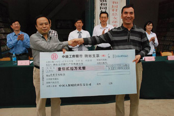 廣西百色市田東縣甘蔗旱災(zāi)保險(xiǎn)賠款現(xiàn)場(chǎng)兌現(xiàn)大會(huì)上,獲賠農(nóng)戶代表上臺(tái)領(lǐng)款。韋文孟/攝 |