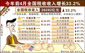 國家稅務總局12日公布的數(shù)據(jù)顯示,1-4月份,全國稅收收入(不包括關稅、船舶噸稅、耕地占用稅和契稅,未扣減出口退稅)延續(xù)了去年四季度的增長勢頭,完成26282億元,比上年同期增長33.2%,增收6545億元。其中,個人所得稅增長21.8%,分析稱今年1月1日起開始對個人轉(zhuǎn)讓限售股所得征收個人所得稅是實現(xiàn)增長的一個原因。 根據(jù)統(tǒng)計數(shù)據(jù),分稅種看,主體稅種收入較快增長,除個人所得稅外,國內(nèi)增值稅增長13.7%,國內(nèi)消費稅增長57.7%,營業(yè)稅增長37.9%,企業(yè)所得稅增長41.1%,車輛購置稅增長63.5%,海關代征進口稅收增長56.3%。分地區(qū)看,西部地區(qū)增長領先,東、中、西三大區(qū)域稅收收入分別增長32.6%、32.3%和36.8%。 分析認為,經(jīng)濟增長為稅收增長奠定了稅源基礎。進入2010年以來,我國經(jīng)濟企穩(wěn)回升態(tài)勢更加明顯,與稅收密切相關的經(jīng)濟指標較快增長,一季度GDP同比增長11.9%,比去年四季度增幅提高1.2個百分點,規(guī)模以上工業(yè)企業(yè)增加值增長19.6%,工業(yè)品出廠價格上漲5.2%,社會消費品零售總額增長17.9%,進口商品總值增長64.6%,房地產(chǎn)投資額增長35.1%,1-2月份規(guī)模以上工業(yè)企業(yè)利潤增長119.7%,直接帶動國內(nèi)增值稅、海關代征進口稅收、營業(yè)稅和企業(yè)所得稅大幅增長。 稅收政策調(diào)整也帶來了增收。2009年應對國際金融危機的結(jié)構(gòu)性減稅政策,促進了經(jīng)濟的增長,培植了稅源。如增值稅轉(zhuǎn)型對機器設備投資增長拉動作用明顯,車輛購置稅減半征收促進了汽車工業(yè)發(fā)展,提高出口退稅率直接降低出口產(chǎn)品的稅收負擔,促進外貿(mào)出口增長。 與此同時,一些增收政策則繼續(xù)體現(xiàn),如成品油稅費改革和卷煙消費稅政策調(diào)整翹尾增加較多收入,1-4月份國內(nèi)消費稅中的成品油和卷煙消費稅分別增長51.7%和58.9%,共增收660億元,占增收總額10.1%。排氣量1.6升以下機動車車輛購置稅稅率由5%提高到7.5%帶來車輛購置稅大幅度增長,限售股轉(zhuǎn)讓所得征收個人所得稅也增加了一些收入。 此外,去年同期基數(shù)較低、依法加強稅收征管等也是今年前四個月稅收收入繼續(xù)保持較快增長的主要原因。