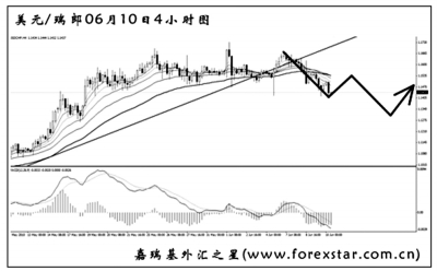 ▲美元兌瑞郎將4小時圖的上升趨勢線跌破,此前一連串的MACD頂背離信號發(fā)揮了一定的效果,目前有階段性筑頂成功的跡象,但目前下結(jié)論還為時尚早。短線的強(qiáng)動能交替節(jié)奏頻繁,操作有一定的難度。此波美元兌瑞郎有望向前方道氏點(diǎn)1.1265挺進(jìn),但跌破的希望不大。