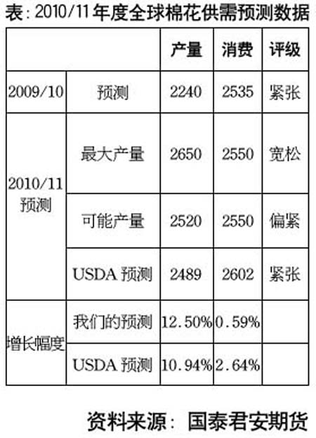 近段時間以來,國內(nèi)棉花價格穩(wěn)步上漲,并成功站上高位。不斷擴大的銷售利潤使得供給方變得更加惜售,在全社會可供總量非常緊張的情況下,下游企業(yè)不得不被動接受高昂的棉價。在接下來的7-8月,由于社會庫存的進一步消耗,棉花的供應(yīng)形勢可能更加緊張,棉花價格由于缺乏有效的利空作用,還看不到要下跌的任何跡象。因此,從短期來看,支持棉價上漲的因素依然存在,棉價繼續(xù)上漲是大概率事件。 當前棉花價格的高企歸功于供需關(guān)系的相對緊張。2009年8月份以來,全球棉花供需關(guān)系開始由緩和轉(zhuǎn)變?yōu)橼吘o(產(chǎn)量減少、消費增加),棉花價格也隨之大幅度上漲。美國農(nóng)業(yè)部6月供需報告顯示,全球2009/10年度棉花產(chǎn)量預估為1.0289億包,2008/09年度棉花產(chǎn)量預估為1.0740億包。6月份預估消費為1.1643億包,2008/09年度預估消費為1.0994億包,增加647萬包。在全球經(jīng)濟從歷史的低谷逐步走出來以后,商品價格集體回暖為棉花價格上漲提供了可靠的大環(huán)境,而惡化的供需矛盾則為棉價安裝上了騰飛的翅膀。 但2010/11年度棉花價格有望從高位回落。因為高價格會刺激棉花主產(chǎn)區(qū)面積擴種,從而會極大地緩和供需偏緊的基本格局。根據(jù)我們的預測,2010/11年度,全球棉花產(chǎn)量將從本年度的2240萬噸增加到2520萬噸,合計增產(chǎn)280萬噸,增幅為12.50%。產(chǎn)量增加使得“供需情況”得到很好改善,并對基金多頭形成威懾,使得多逼空的可能性進一步減小,價格繼續(xù)上漲的動力被有效削弱。 歷史經(jīng)驗告訴我們,高價格往往難以為繼。預計到2010年12月份,棉花價格也有望從目前的18000元/噸回落到14000-16000元/噸的核心區(qū)域,價格下跌的最可能月份大概在10月份以前。