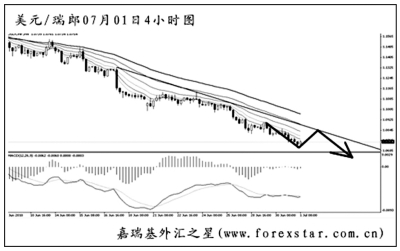▲美元兌瑞郎近期一直以下跌走勢為主,日線圖最近3周交易日只有2天收陽線,空頭動能強(qiáng)勁。小時圖和4小時圖均出現(xiàn)了MACD底背離信號,匯價有向上調(diào)整的欲望。關(guān)注下降趨勢線的阻力1.0830一線,預(yù)計美元兌瑞郎大幅升破趨勢線的希望不大。