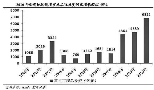 券商普遍認(rèn)為,西部大開發(fā)投資項(xiàng)目的出臺(tái),“穩(wěn)增長”的意圖明顯,是“保增長”政策的延續(xù)。對股市有提振作用。 上海證券直接將西部大開發(fā)新增投資計(jì)劃稱為“縮小版經(jīng)濟(jì)刺激計(jì)劃”。 該券商發(fā)布的報(bào)告稱,當(dāng)前的6822億新增西部開發(fā)投資計(jì)劃,是應(yīng)對海外危機(jī)不確定性演變的“縮小版經(jīng)濟(jì)刺激政策”。國內(nèi)外經(jīng)濟(jì)形勢的不確定性,增加了市場對中國經(jīng)濟(jì)二次探底的擔(dān)憂。在當(dāng)前這種背景下,“新一輪經(jīng)濟(jì)刺激計(jì)劃”的出臺(tái),將極大增強(qiáng)市場對中國經(jīng)濟(jì)增長持續(xù)性的信心。 國信證券表示,西部大開發(fā)投資項(xiàng)目出臺(tái)對市場影響正面。